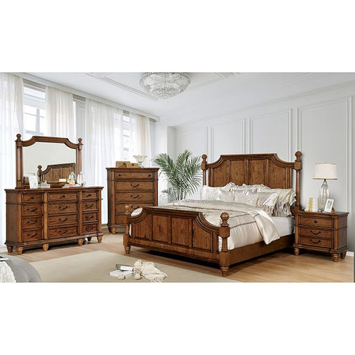 Classic, almost farmhouse, in its appearance this bedroom collection showcases how even natural tones can pop out in a room. A prominent wood grain eases the lavish design details into its homey state.