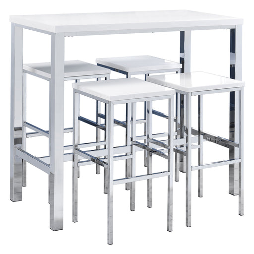 Ultra-modern with a clean lined silhouette, this five-piece bar set comes complete with a rectangular shaped bar table and four bar stools. Perfect for more contemporary home, the table comes with sleek and square legs made and a steel frame in an electroplated and polished chrome finish that lends a luxurious gleam to any room. The tabletop features a high gloss white lacquer finish and seats four people comfortable. Each stool also features a matching lustrous high gloss white seat and matching legs. One the stools are also footrests for extra support and stability. Key Features: • Contemporary five-piece pub height bar set • Set includes bar table and four (4) backless bar stools • Steel frame electroplated and polished in chrome • High gloss white lacquer finished tabletop and seats • Constructed with steel and MDF