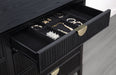View full detailsA rich black finish create a sophisticated palette for a four-piece modern bedroom set. Complete with wire brushing that creates texture, the set f...