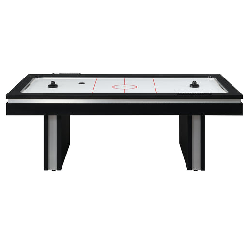 The Cloud Air Hockey Table is the definition of fun. Get ready for hours of competitive games with your family and friends. This table has black laminate veneer that surrounds the table and has accents of a white laminate stripe for a modern look. Play one on one, as this table comes with two puck pushers, two pucks and two score boards. The wide table legs provides additional stability for those competitive gamers. So, plan the next game night at your house and you will surely enjoy it. Features: • Contemporary two tone styling • Two playing paddles and puck included • Welcome addition to any games room Dimensions: Depth: 47.0" x Width: 84.0" x Height: 31.0" Weight: 157.0 lbs.