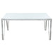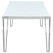 Clean lines and sleek materials give this dining table a distinctly modern edge. The white frosted tempered glass top offers a bright, airy look, while the polished stainless steel frame delivers durability and shine. Designed with geometric, hairpin-inspired legs, this rectangular dining table comfortably seats six and suits both casual and formal dining spaces with effortless style. Key Features: • Modern dining table features a sleek, contemporary silhouette • White frosted tempered glass top creates a clean, sophisticated surface • Polished stainless steel frame adds lasting strength and visual appeal • Hairpin-style legs with exposed corner brackets for a modern twist • Crafted from heavy-gauge metal and 12mm thick glass for long-term durability • Versatile size comfortably seats up to six for everyday or formal meals